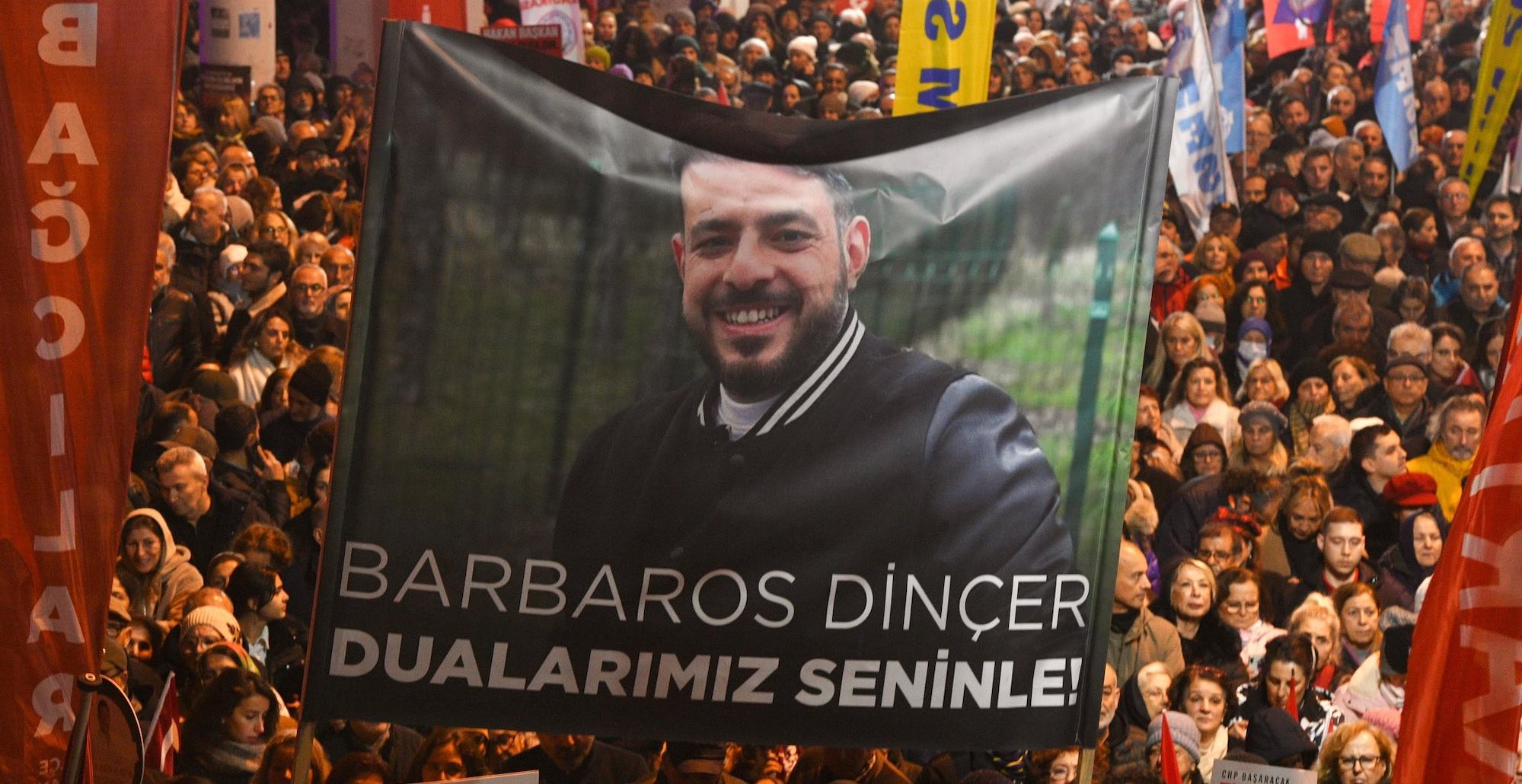 Miting alanında geçtiğimiz günlerde geçirdiği beyin kanaması sonucu halen yoğun bakımda olan ve sağlık durumu ciddiyetini koruyan CHP Gençlik Kolu eski Genel Başkanı Barbaros Dinçer için de, Dualarımız seninle" pankartı açıldı.