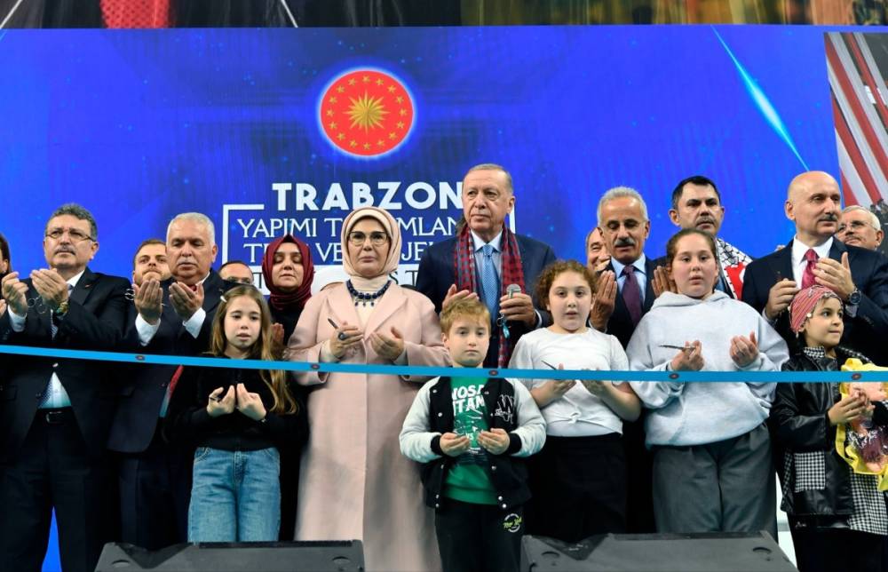 Trabzon Hayri Gür Spor Salonu'nda **"Yapımı Tamamlanan Tesis ve Projelerin Toplu Açılış Töreni"**nde konuşan Erdoğan, Özel'in Brüksel mitingindeki açıklamalarını eleştirerek şunları söyledi: