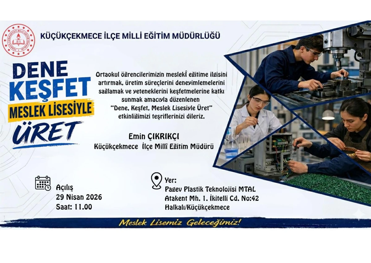 Küçükçekmece’de mesleki eğitimi teşvik etmek amacıyla düzenlenen “Dene, Keşfet, Meslek Lisesiyle Üret” etkinliği, öğrencilerden büyük ilgi görüyor. Küçükçekmece İlçe Millî Eğitim Müdürlüğü koordinasyonunda gerçekleştirilen organizasyon, 29-30 Nisan 2026 tarihlerinde PAGEV Plastik Teknolojisi Mesleki ve Teknik Anadolu Lisesi ev sahipliğinde iki gün boyunca devam ediyor.