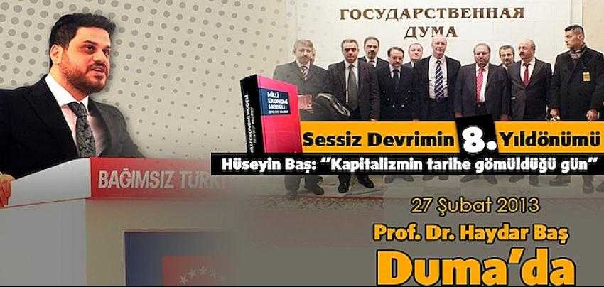 BTP lideri açıklamasında, "27 Şubat 2013, Prof. Dr. Haydar Baş'ın gizlenmek ve örtülmek istenen fikirlerinin, devrimlerinin gizlenemeyeceği gerçeğiyle tüm dünyanın tanıştığı gündür. Duma'da Prof. Dr. Haydar Baş sadece tezini tanıtmaya gitmemiş, aynı zamanda sessiz devrimi ile kapitalizmi tarihe gömdüğünü ilan etmiştir" ifadelerini kullandı.