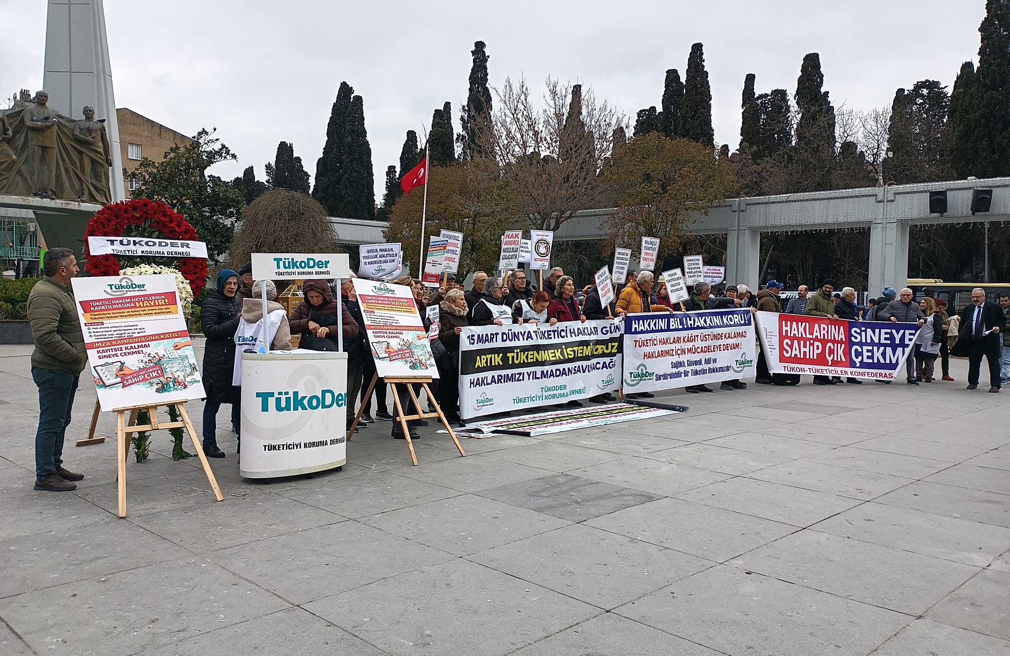 15 Mart Dünya Tüketici Hakları Günü nedeniyle Tüketiciyi Koruma Derneği (TÜKODER) tarafından Bakırköy Özgürlük Meydanı’nda çelenk koyma töreni ve basın açıklaması gerçekleştirildi. Basın açıklaması öncesi konuşan TÜKODER Genel Başkanı Aziz Koçal, tüketicilerin yalnızca güvensiz ürünlerle değil, derinleşen yoksulluk, düşen alım gücü ve sosyal eşitsizliklerle de mücadele etmek zorunda kaldığını söyledi.