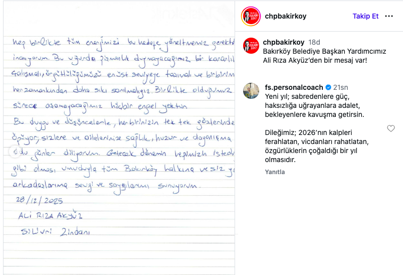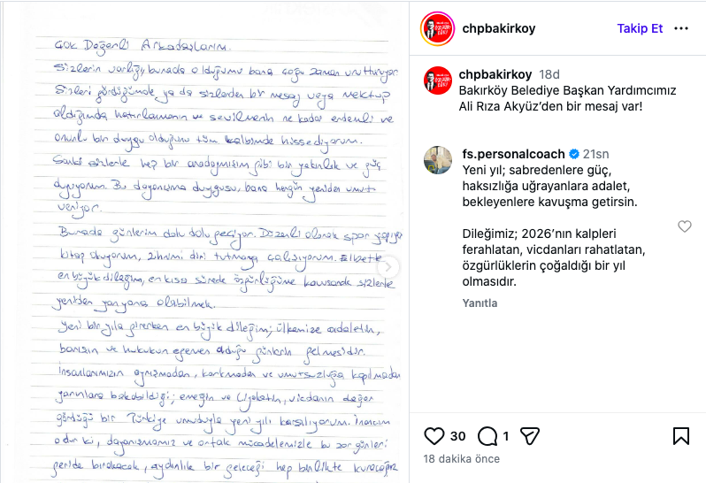 CHP Bakırköy İlçe Başkanı Gizem Başaran Arslan, partisinin kurumsal sosyal medya hesabından yaptığı paylaşımda, tutuklu başkan yardımcısı Ali Rıza Akyüz’ün “Yılbaşı Kutlaması” başlığıyla partililere gönderdiği mektubu paylaştı.