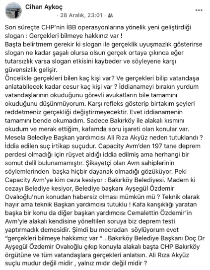 Öte yandan CHP Bakırköy’de önceki dönem bir süre ilçe yöneticiliği yapan, son dönemde ise İl Delegesi olarak görev alan Cihan Aykoç’da konuyla ilgili bir paylaşım yaptı. Sosyal medya hesabından açıklama yapan Aykoç, CHP’nin son dönemde kullandığı “Gerçekleri bilmeye hakkınız var” sloganına atıfta bulunarak, slogan ile gerçeklik arasında bir tutarsızlık oluşmaması gerektiğini savundu.